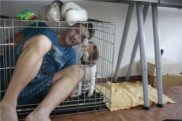 у заводчицы папы толстого живет 2 бигля - Знатик и Кучум и спят они в одной гигантской клетке в коридоре, а в клетке лежит супер специальная подушка! по ней сразу видно - мягкая до умопомрачения! заводчица говорила, что толстый потом туда бегал спать. пока папа с дядей его не видят  уж больно уютное место