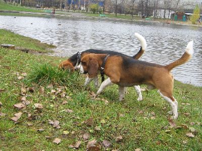 Сначала освободим себя от комплекса вины. Это не отсутствие воспитания или дрессировки, это биглиная сущность. Если бы меня попросили охарактеризовать породу бигль одним словом, я бы сказала "НОС". И невозможно заблокировать в собаке эти природные качества. Правда, одна английская заводчица утверждала, что она смогла в своих биглях убить охотничий инстинкт. Но, слава богу, ее утверждения оказались беспочвенными. По крайней мере, одного бигля ее разведения я знаю, и он прекрасный охотник. Но вернемся к причине этого необычного увлечения. Как известно, по природе своей собаки макросматики, а это значит, что большую часть информации об окружающем мире они получают через обоняние. Для большинства животных самый ясный след — это как раз след запахов. Запахи оказывают мощное влияние как на физиологию, так и на поведение собаки. Итак, каким же образом работает аппарат обоняния собаки? Мы уже подробно писали об этом в нашей статье "Нюхаю - значит, существую". Молекулы запаха, попадая в носовую полость собаки, действуют на белковые рецепторы, расположенные на внешних концах обонятельных клеток, создавая ансамбль импульсов. Сила и мощность состава импульсов зависит от концентрации запаха и от количества рецепторов, включенных в работу. Острота обоняния зависит именно от этого количества работающих рецепторов и обусловлена природным и наследственным факторами. Химические сигналы от запахов преобразуются в электрические сигналы и передаются в часть мозга, отвечающую за эмоции. В результате многократных опытов учеными был сделан вывод, что по тонкости восприятия запахов и умению анализировать мизерные концентрации веществ собаки не имеют себе равных, и человечество оценило это прекрасное качество собак. Самые известные специальности, которые получили собаки благодаря своему тонкому обонянию, это биглебригады по поиску наркотиков на таможне, поисковики-спасатели при схождении лавины и землетрясениях, собаки миннорозыскной службы и, конечно, розыскные собаки при полиции. В 1965 году финские газеты сообщили о рудорозыскной овчарке Лари. Лари разыскала 1330 камней с запахом серного колчедана в отличие от опытного специалиста, который в тот же период времени нашел всего 270. Это был первый опыт, который послужил толчком для использования собак в качестве запахолокаторов в геологии. Известно, что запах, издаваемый некоторыми минералами (самородный мышьяк, арсенопирит и др.), особенно при ударе или разломе, указывает на присутствие их в породе. Собаки обнаруживали залежи руды, лежавшие на глубине до 12 метров. В Германии собаки работают в качестве "инспекторов" газовых сетей. В Швеции собак используют для проверки домов на наличие плесени. В Калифорнии уже несколько лет Общество защиты окружающей среды использует биглей для поиска деревьев, пораженных насекомыми-паразитами, для проведения местного лечения дерева. По рассказам пастухов было известно, что собака по запаху безошибочно может выбрать течных коров из стада. Это сподвигло доверить собаке весьма ответственное задание - участвовать в искусственном осеменении коров. Способность коров к искусственному осеменению высока, но при условии, что правильно "пойман" момент, отведенный для этого акта природой. Вот и приходит на помощь животноводу собака с ее замечательным нюхом. Это тольк